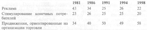 Стимулирование продаж продукта включает набор средств, предназначенных для активизации реакции потребителей в течение короткого периода времени. Большая часть усилий этого рода приходится на те части каналов дистрибьюции, которые непосредственно взаимодействуют с потребителями. В области рекламы и стимулирования продаж происходит перераспределение выделяемых на эти направления средств: все большая доля приходится на продвижения, ориентированные на торговлю (на каналы дистрибьюции, рис. 32).