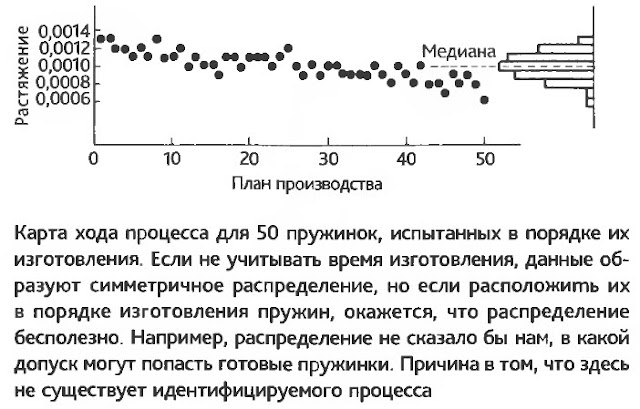 На рис. 6 показано распределение результатов замеров 50 пружинок одного вида, используемых в фотоаппарате определенного типа. Пружинки измерялись растяжением под действием силы 20g. Распределение выглядит довольно симметричным… Любая попытка использовать распределение, показанное на рис. 6, бесполезна. Например, расчет стандартного отклонения для данного распределения не даст значения, которое можно использовать для предсказания. Оно ничего не говорит о процессе, поскольку он нестабилен.